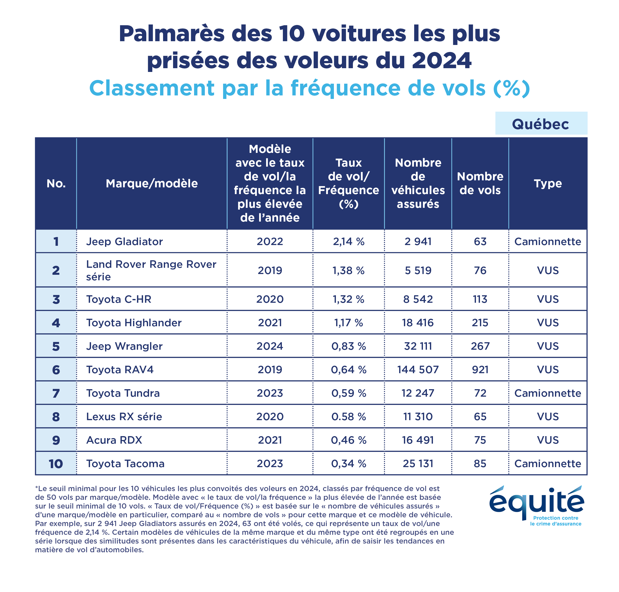 La liste des 10 véhicules les plus (ou moins) volés n'est fournie qu'à titre d'information. Équité Association fait de son mieux pour s’assurer de l’actualité et de l’exactitude des informations fournies. Toutefois, elle ne peut pas garantir que les informations fournies ou accessibles directement ou indirectement par le biais de ce site Web sont exactes, complètes, fiables et à jour. Les informations sont susceptibles d’être modifiées sans préavis et ne doivent pas être considérées comme un avis ou un conseil professionnel. Les informations fournies sur ce site ne doivent pas être utilisées pour l’achat, la vente, la location ou l’évaluation d’un véhicule, et elles ne doivent pas être interprétées comme une recommandation ou une détermination d’adéquation.
